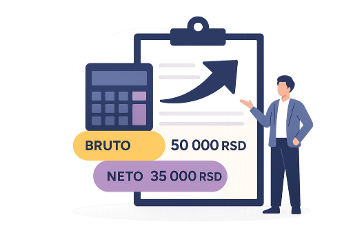 Unesite iznos u NETO i dobićete izračunat iznos u BRUTO iznosu. Obračun je okviran i izražen u dinarima (RSD).